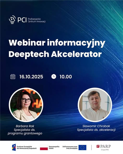 W imieniu naszego Partera – Podkarpackie Centrum Innowacji, serdecznie zapraszamy przedsiębiorców do wzięcia udziału w webinarium informacyjnym dotyczącym programu Deeptech Akcelerator, który odbędzie się 16.10.2025 (czwartek) o godz. 10:00.